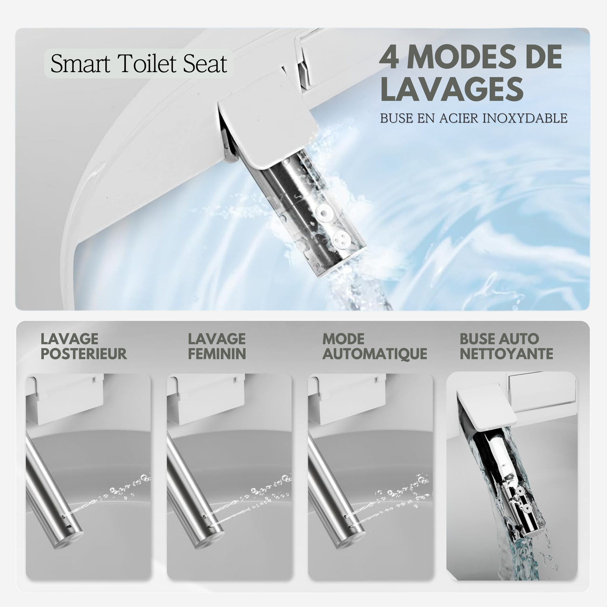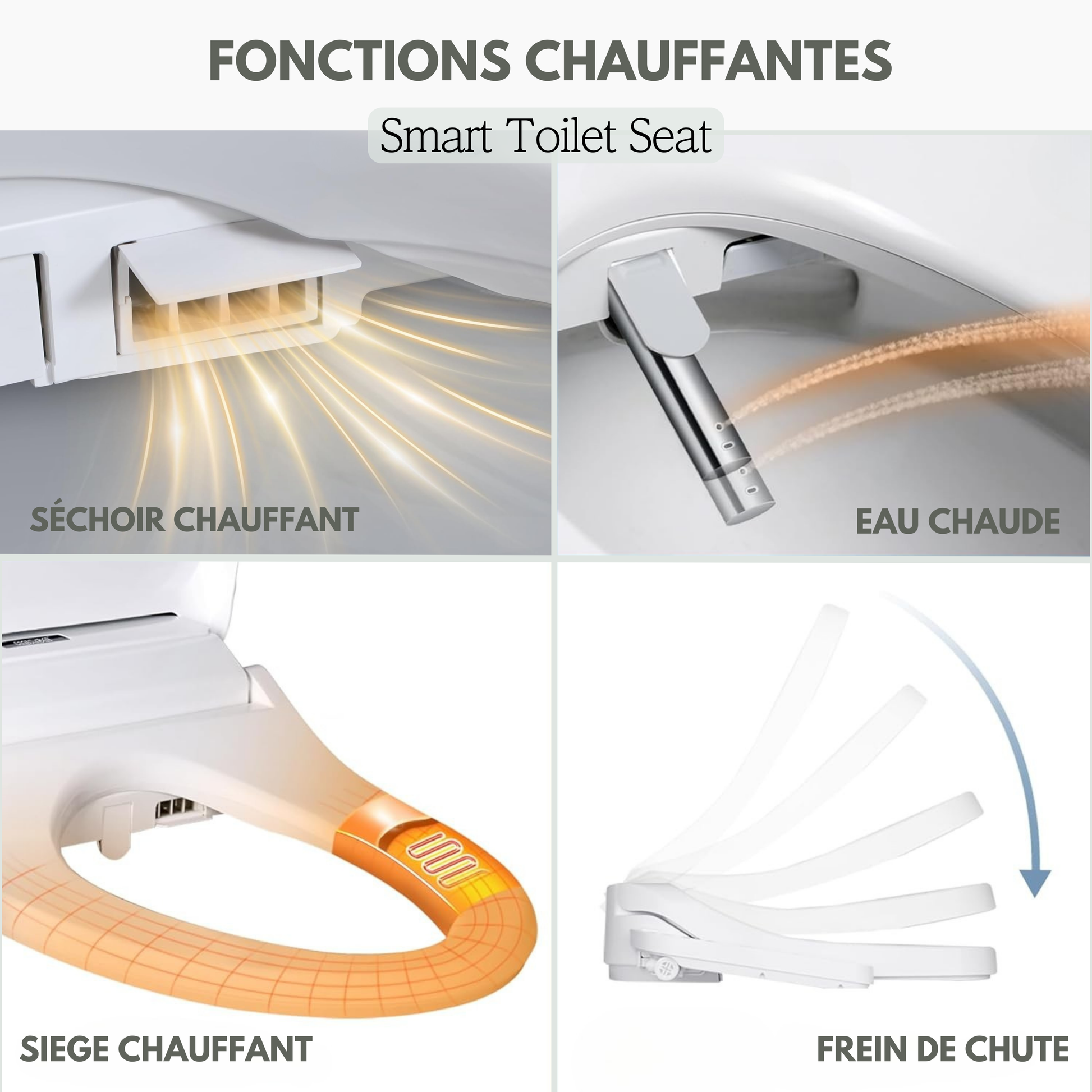 - 💮Design élégant & sécurité renforcée : plastique ABS antibactérien, frein de chute pour une fermeture douce, protections anti-surchauffe et matériaux premium conformes aux normes CE. Une toilette japonaise à la maison.